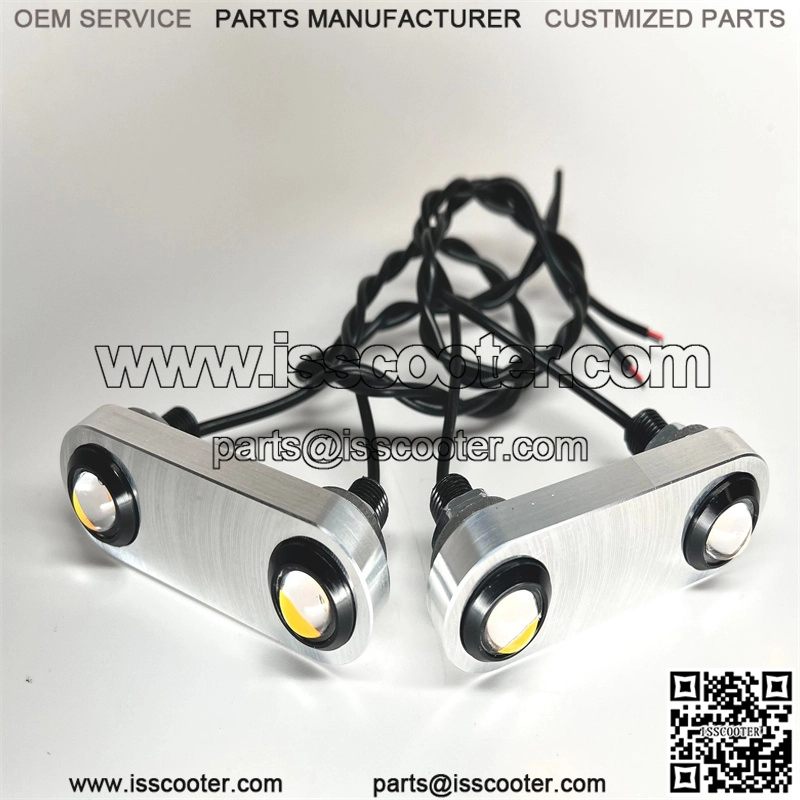 Clean, cost effective LED blinker kit. These go in place of the yamaha badge. These are CRAZY crisp and bright, much safer and more visible than the oem blinkers. You will need to wire these in, and purchase (2) resistors, or use a LED relay. No drilling required, but you will need to run wiring from your harness to these units. These can be used on ANY scooter with a flat panel, such as ruckus, etc!