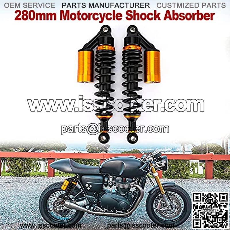 High-performance shock absorber: The suspension provides smoother driving and better overall damping management, improving driving comfort, motorcycle handling and driving safetyProduct fitment: general-purpose air shock absorber, suitable for most 90cc 150cc-750cc street cars, Karting (karting), scooters and Moped Quad (ATV), with a force of 280mm. A great choice for upgrading your motorcycles and off-road vehicles.Product material: CNC aluminum alloy + high-strength steel, high-performance spring. Steel anti-corrosion, waterproof, anti-rust, personalized appearance (Black +Gold)Product parameters: Total length: 315 mm (12 3/8 inches). Eye diameter (with sleeve): 12 mm. Maximum eye tensile strength: 2,000 kgf. Spring stiffness: 110 kg. Maximum load: 330 lbs/150KgAdjustable strength: You can adjust the strength that suits you best, to deal with different road conditions.Easy to install,before placing an order, please make sure the size fits your bike.Why choose If you have “10,00
