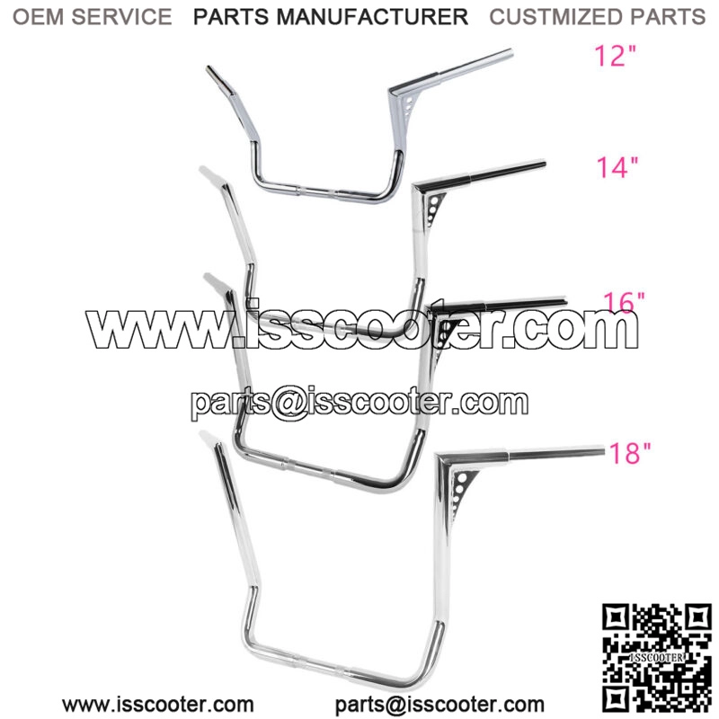 12″/14″/16″/18″ rise. 11″ backward sweep. 1 1/4″-diameter. Center section tapers to 1″ so that standard handlebar controls fit.