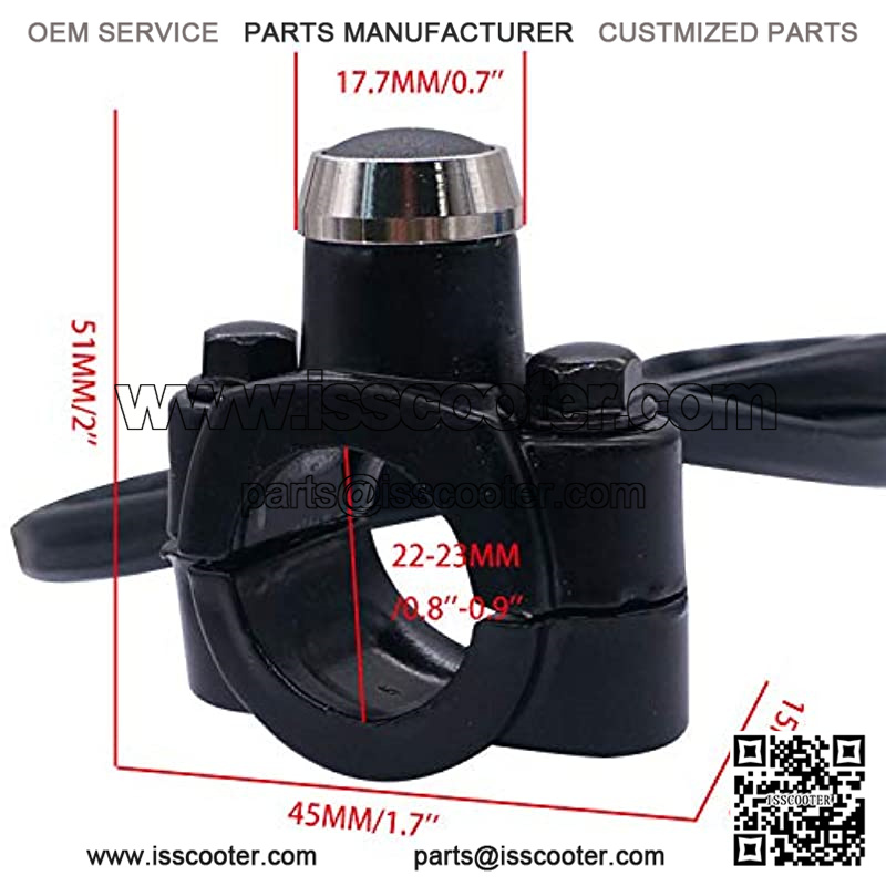 Switch Size(Approx): 51x45x15MM/2”x1.7”x0.6”;Wire Length: 20.08inch/ 55cm;Install diameter: 22MM-23MM;could be used on DC 12V electrical system.