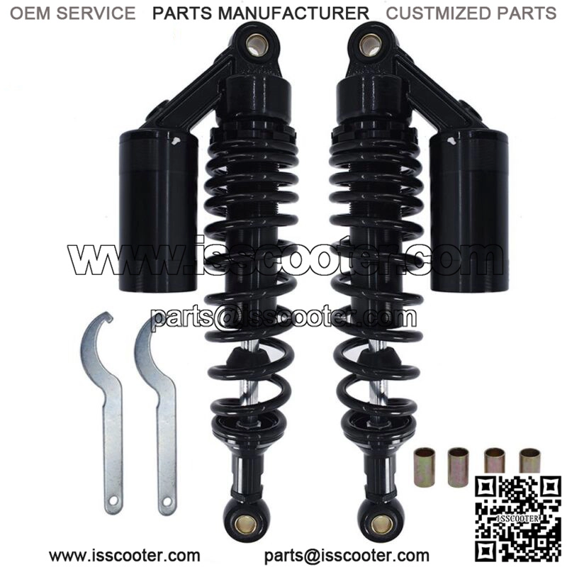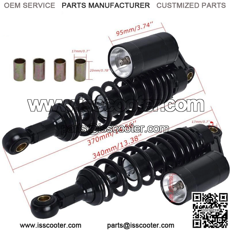Features:Pressure can be adjusted by springs and air (nitrogen).High quality,high-performance motorcycle parts.The damper and spring designed for long durability.Reduce bumps in the driving of motorcycles.Easy to install.Specification:Product Name: Shock AbsorberColor: Black Gold+Black Is AvaiableMaterial: Aluminum+IronTotal Length: 370mm/14.56″Eye Core Length: 340mm/13.38″Eye Diameter: 12mm/0.7″Eye Thickness: 20mm/0.78″Spring Thickness: 8mm/0.31″Spring Width: 60mm/2.36″Working Stroke: 68mm/2.67″Factory Air Pressure: 0.4 MpaMaximum Air Pressure: 0.5 MpaAir Reservoir: AdjustablePlacement On Vehicle: Rear,Left, RightQuantity: 2PCSFitment: For work on most 150cc~750cc street bikes, karting(go kart), scooters and moped quad (ATV) with shocks of 340mm eye to eye distance.(Please Compare With Your Original One Before Purchasing!)Package Includes:2 Shock Absorbers2 Eye Cores2 Adjust Spring Tools