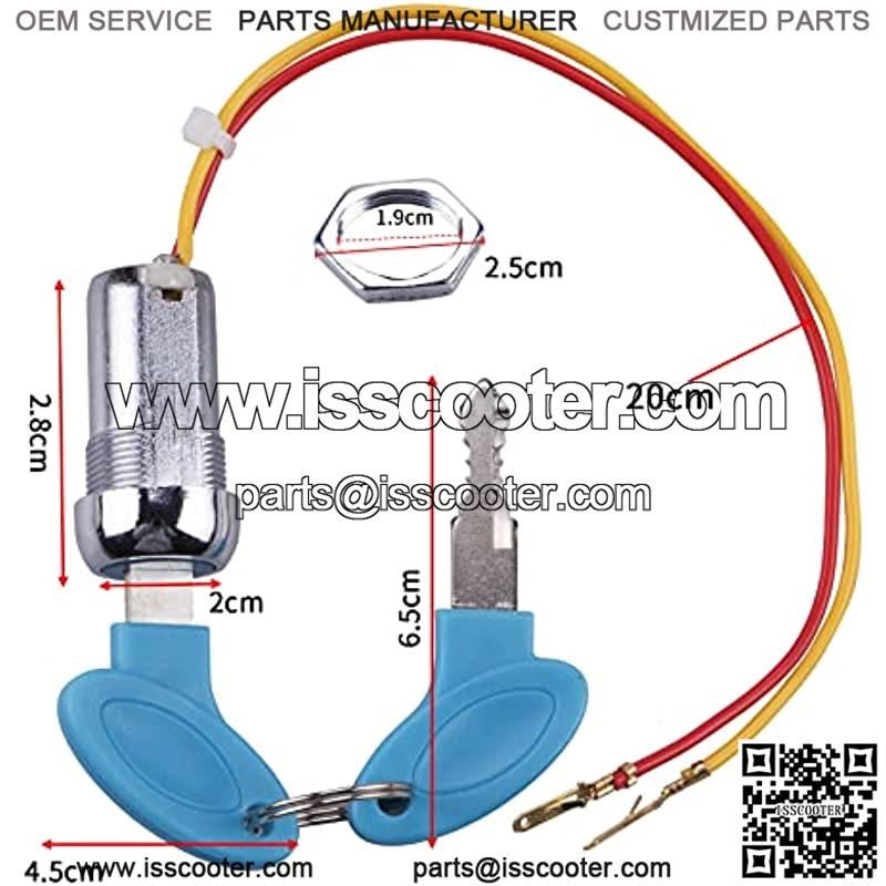 Ignition key Switch compatible with Electric Scooters, Electric bicycle, Gas lever lock, ATV, Moped, Go kartLock diameter: 20mm; Line length:200mm; Key size:65x45mmDesigned with a reliable ignition switch locking mechanismHIGH QUALITY METAL ALLOY:This Ignition Starter Switch is made of metal alloy material,solid to usepackage: 2x Ignition Switch + 4x key