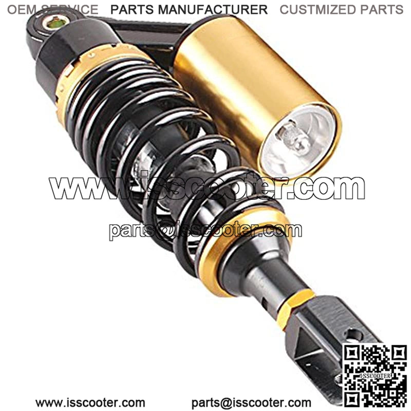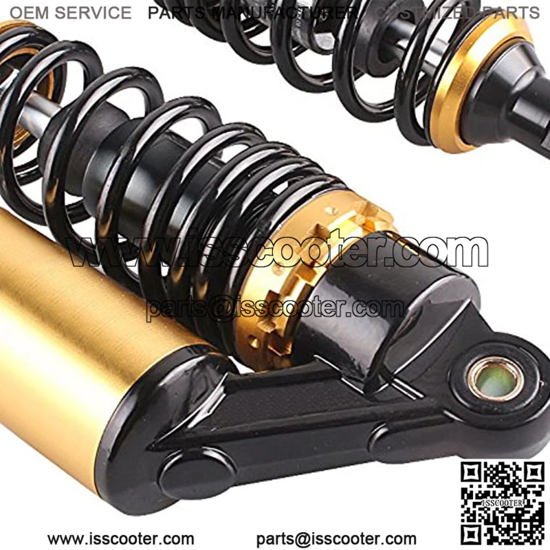 A pair of rear motorcycle shock absorbers, made of quality aluminum and stainless steel;Color: Black & GoldPlacement on vehicle: rear, left, rightBushing hole size: 12mm; Length between holes to clevis: 280mmUniversal for most 150cc~750cc street bikes, Karting(Go kart), Scooters and Moped Quad (ATV) with shocks of 280mm Length of Eye to ClevisColor:U-type 280mm Black Item Specific : Condition: Brand new Color: Black Gold Material: Solid Steel + Aluminum Alloy Fits: Universal Fit. Work perfectly on most 150cc~750cc street bikes, Karting(Go kart), Scooters and Moped Quad (ATV) with 280mm Length between holes to clevis. Dimension: Total Length:315mm (12 3/8″) Length of Eye to Clevis Eye Core:280mm (11″) Clevis Hole Diameter: 8mm Clevis Inner Width: 20mm Clevis Maximum Tensile Strength: 2,000 Kgf Spring Thickness: 7mm Spring Width: 60mm Spring Stiffness: 110 kg Maximum load: 150kg ( 330 lbs) Air Reservoir: Adjustable Factory Air Pressure: 0.4 Mpa Maximum Air Pressure: 0.5 Mpa Package i