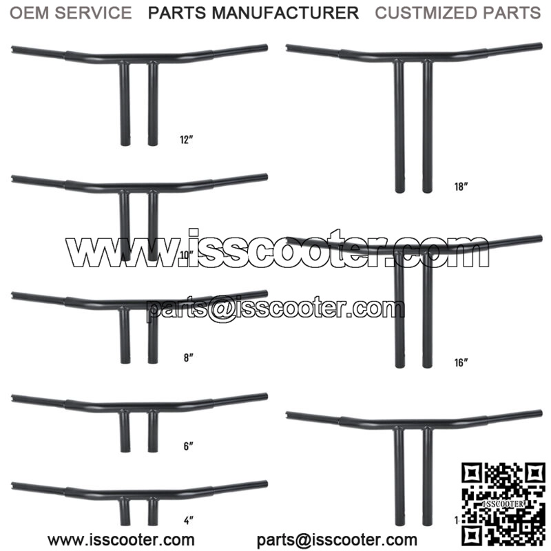 4″/6″/8″/10″/12″ /14″/16″/18″rise. 6″ backward sweep. 1 1/4″-diameter center section tapers to 1″ so that standard handlebar controls fit.