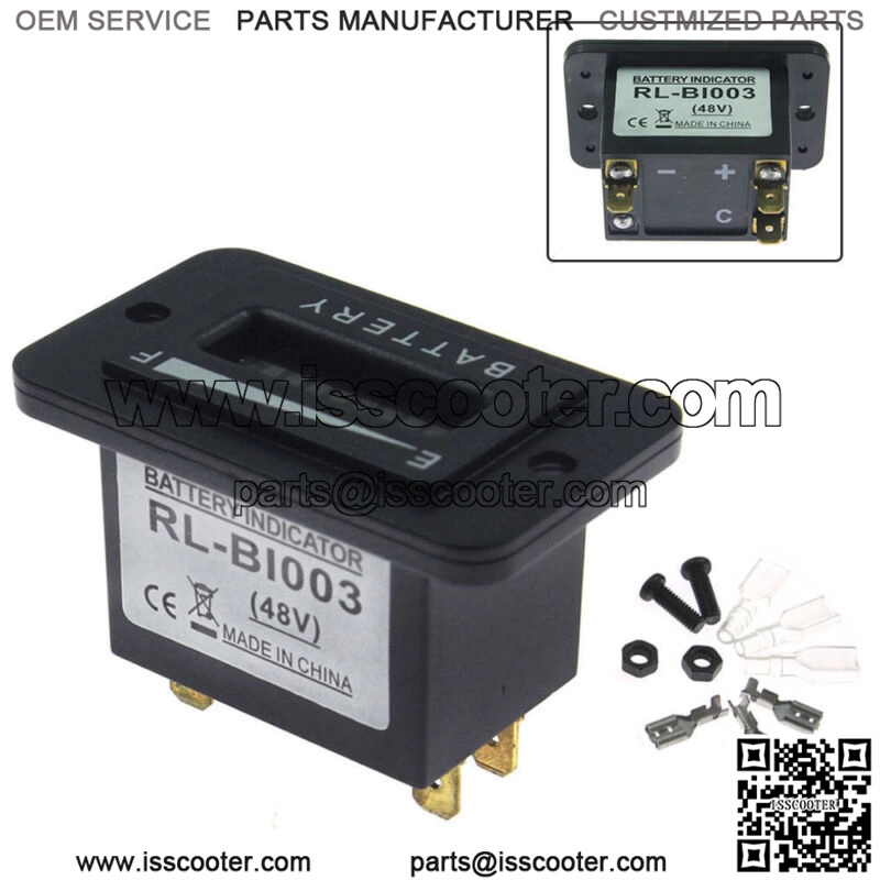 Features:Works with 48V Lead-Acid Batteries in Golf Carts, Forklifts, Trucks, RV’s, ATV’s, UTV’s, Scooters, Boats and MoreMaterial: ABSWaterproof, IP65Temperature Range: -40F to 185FConnection: Pin+ Battery+ Pin- Battery- C-single output for external use1 Year WarrantyOperationOnly when the battery is properly charged then the 10th LED (far right) will be lighted.As batterystate of charge decreases, successive LED lights up, only one at a time.When 2nd (from left) LED flashes, indicating “energy reserve”. When both 1st and 2nd LED flash, indicating “empty”, new battery is needed to replace old one.Battery indicator memorized the battery state is full when leaving factory. When use with a new battery, it should be powered on for at least 2 minutes to indicate the real battery state.Range indication: Green: 41~100%, Yellow: 21~40%, Red: 20% less.Forklift trucks, Golf Carts, RV’s, Boats, Scooters and electric vehicle. etc.Dimensions: Cut-off: 1.5″x1″, distance between holes: 1.75″, dep