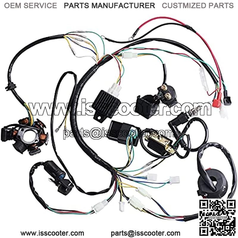 This is a complete electric start engine wiring harness loom,include 1x ATV Wire harness,1x CDI(5Pin AC),1x Solenoid Relay,1xRectifier (Voltage Regulator) ,1x Ignition Switch (2 keys, waterproof),1x Upgraded Multi-functional ATV Switch,1x Stator (Magneto Generator),1x Ignition Coil with lead, 1x Spark plug.