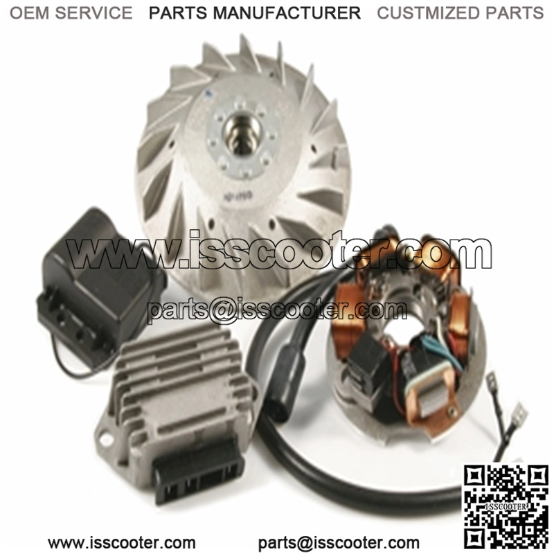 flywheel ca.: 1794gcone 19/20mm12V6 wiresw/o battery, incl. PK flywheel, voltage regulator, e-unit, stator plateProduct descriptionThe easiest way to convert your scooter to electronic ignition is to use an ignition conversion kit. A more constant ignition charge together with all other advantages of an electronic ignition, it is virtually maintenance free and provides more power for your lighting needs, so improving your passive traffic safety. The small frame conversion kits include a flywheel, stator plate, voltage regulator and an electronic regulator unit and are intended for electrical systems without a battery. For crankshafts with a thicker end cone profile we can offer you the choice between the HP4 flywheel or the flywheel from the PK model. The smaller end cone profiled crankshafts can also be fitted the HP4 flywheel with the smaller diameter centre without having to split the ‘cases to change the crankshaft. With early models slight modifications to the flywheel cover might