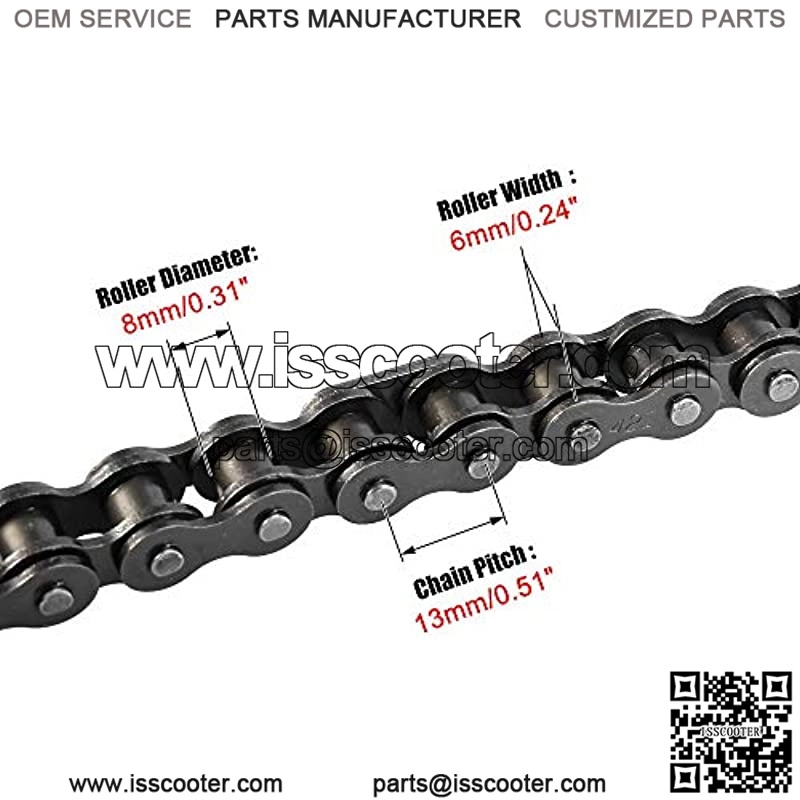 Chain Pitch: 13mm/0.51″; Roller Width: 6mm/0.24″; Roller Diameter:8mm/0.31″; Chain Breaker Size: 9x12cm/3.54″x4.72″(L*W).