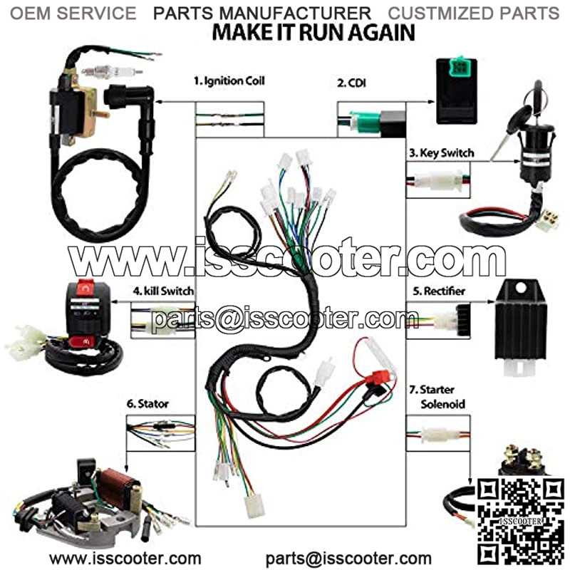 Package Includes1x ATV Wire harness 1x CDI(5Pin AC) 1x Spark plug 1x 2 Wire Ignition Coil 1x Solenoid Relay 1x Rectifier (Voltage Regulator) 1x Multi-functional ATV Switch 1x Ignition Key Switch (2 keys) 1x Stator Complete electric start engine wiring harness loom fit most 50cc 70cc 90cc 110cc 125cc Pit Bike, Quad, Dirt Bike, ATV, Dune Buggy, Go Karts, 4 wheelers.