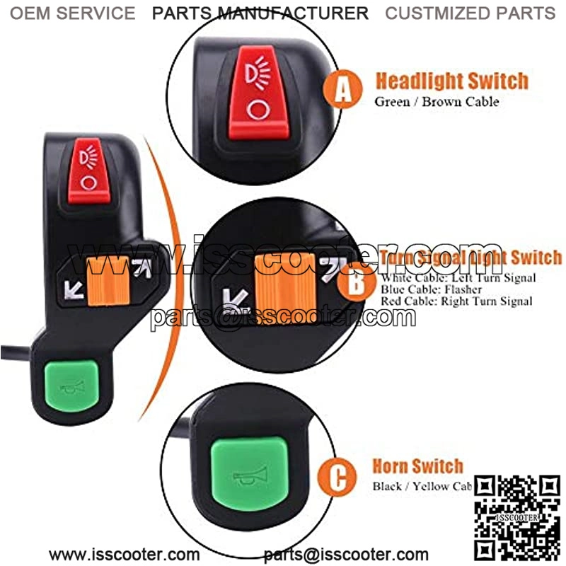 Excellent performance: Classical black with colorful on/off button, elegant design, an add-on decoration to increase motoycle style. Function integrated switch with 3 buttons for headlight, turn signal light, and horn.
