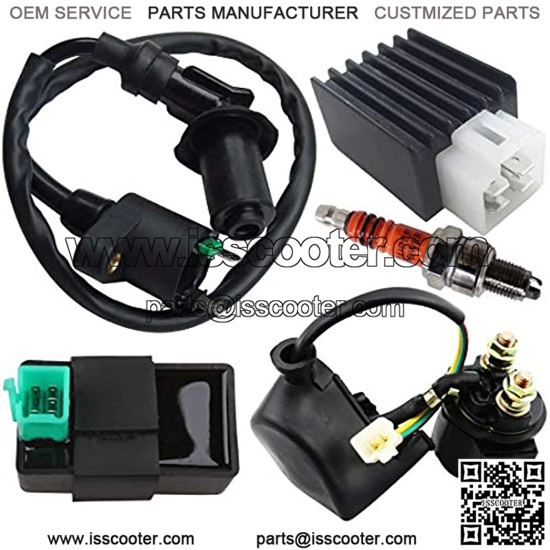 Package contain parts:Ignition Coil + 5 PINS CDI module + 4-pin Voltage Regulator Rectifier + Solenoid Relay + 3 electrode spark plug.The item fits for 50cc 70cc 90cc 110cc 125cc horizontal engine,not for GY6 or CG engine.5 Pins CDI Box for Chinese Made 50cc 70cc 90cc 110cc 125cc 4-stroke Horizontal Engine ATV Go Karts Dirt Bikes Pit bike.12V 4-pin Voltage Regulator Rectifier for 50cc 70cc 90cc 110cc 125cc ATV Scooters Go Karts Quad 4 Wheelers Moped Dune Taotao Sunl Jonway Buggy Sandrail Roketa.Starter Solenoid Relay for 50cc 70cc 110cc 150cc 250cc TaoTao Roketa Sunl Baja Kazuma Sunl Meerkat Falcon kinroad ATV.Feel free contact us by emails if you have any problems.Product Description The item fits for 50cc 70cc 90cc 110cc 125cc horizontal engine,not for GY6 or CG engine.This kit include:1 x Ignition Coil1 x 5-pin CDI module1 x 2-pin Male Plug Relay1 x 12v 4-pin Voltage Regulator1 x Racing 3 electrode spark plug