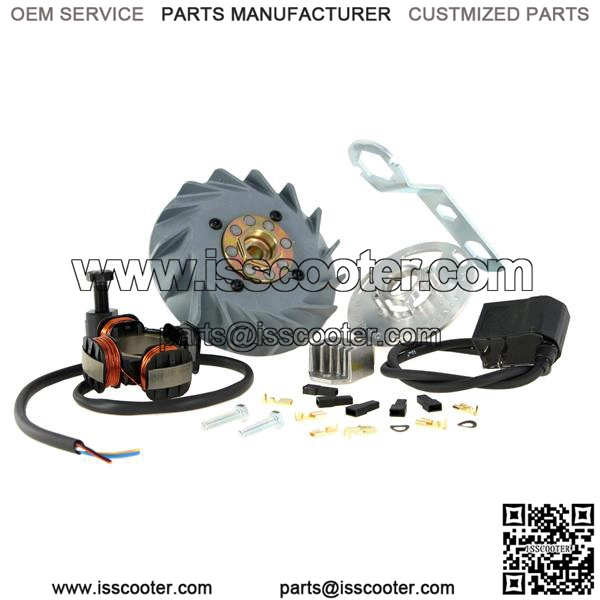 The technical features are as follows: Timing adjusts automatically, with a pre programmed curve of up to 8 degrees Nylon fan, light with good air flow for cooling. Can be used with the standard cowls High power output, 12V 90W easy starting, greatly improved performance HT coil and regulator are both efficient and compact, can easily be fixed anywhere The regulator supplies a clean current assuring stable current for long life for bulbs and electrical system