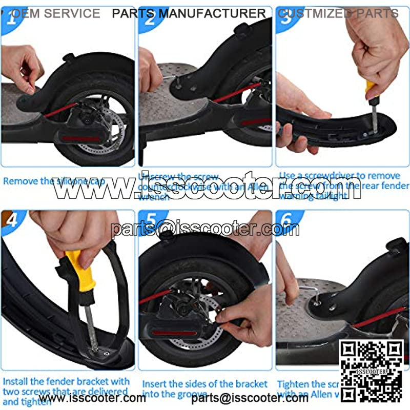 Rear fender bracket: the rear fender bracket is already equipped with 2 mounting screws, no more screws are needed, you can just unscrew the rear warning light screw, fix the mudguard bracket on your electric scooter with existing bolts, adjust the elements to ensure a safe installing