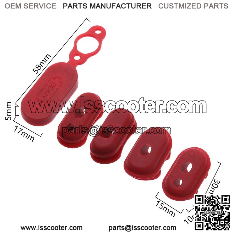 Universal m365 Electric Scooter Pro Accessories Red Silicone Cord Sleeve Silicone Harness Four Pack Suitable for: Mijia M365 Scooter Material: Silicone Red Charging Port Cover Size: 58x17x5mm / 2.28*0.67*0.20” Silicone Cap Size: 30* 15*10mm/1.18*0.59*0.39” Quantity: 4/5 pieces (according to your choice) Product Category
