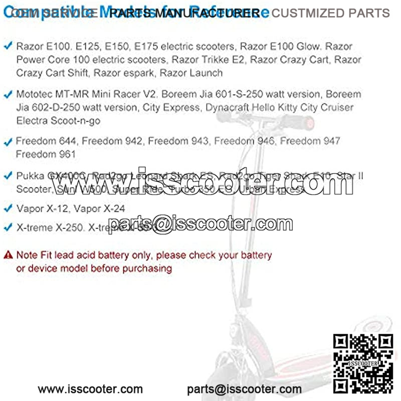 Compatible products: Razor E100 E200 E225S E300 E325S E125 E150 E500 E175 PR200 MX350 MX400 PR200 Battery Charger; Power Core 100, Razor, eSpark, eGlow, Trikke E2, Razor part # W13110050014; Ground Force; Mini Chopper; Pocket Rocket; Pocket Mod; Sports Mod.