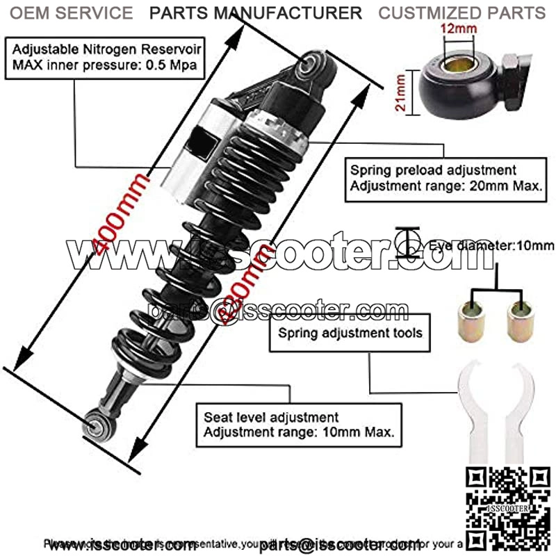 Bushing hole size: 12mm; Length between hole to hole: 400mm. Motorcycle shock absorber universal fit for most vehicles