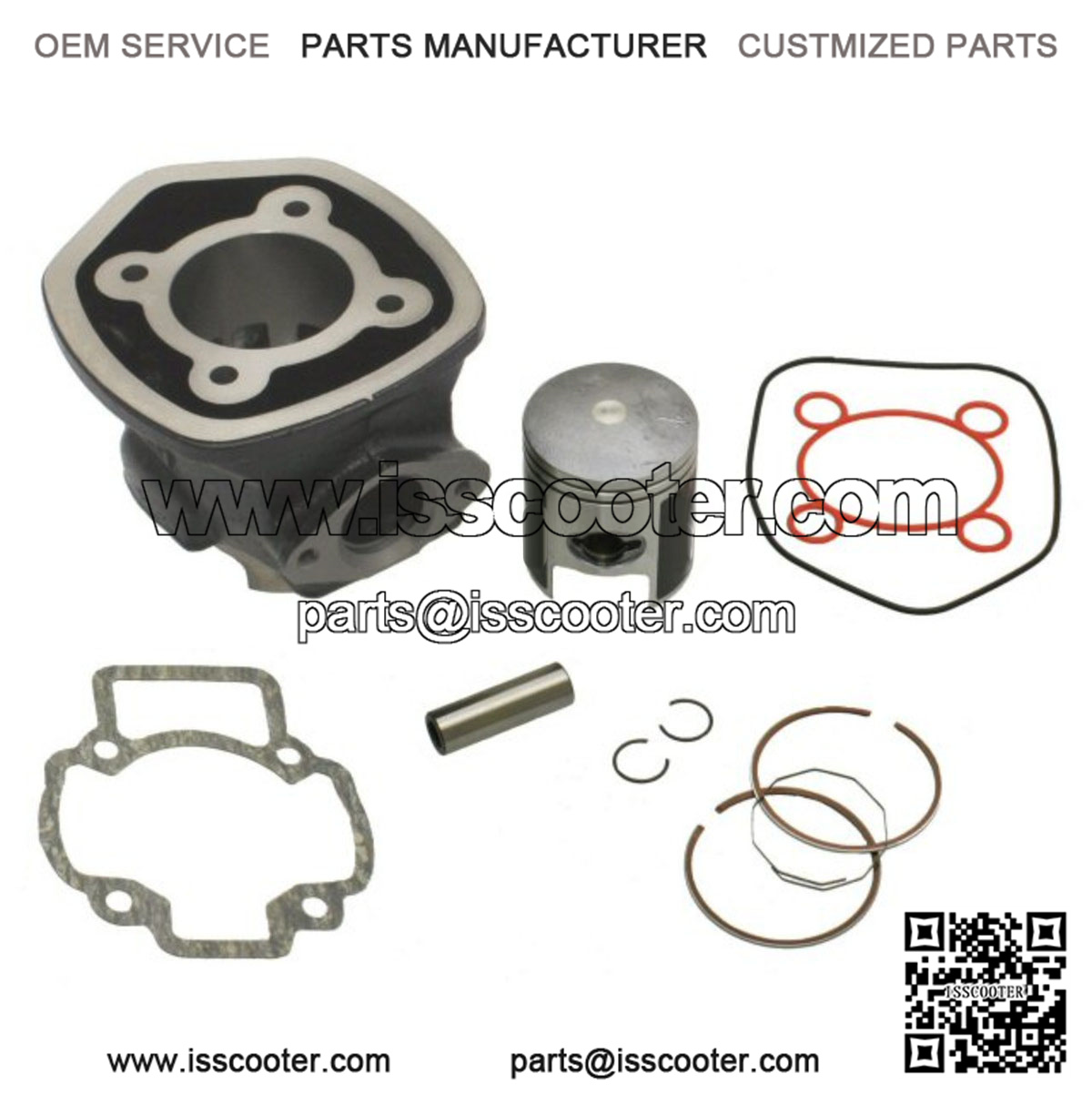 70cc Liquid Cooled Pentagonal Piaggio Big Bore Cylinder Kit. Kit includes cylinder, low-friction molybdenum coated piston, rings, piston pin, cir clips, head gasket and base gasket.