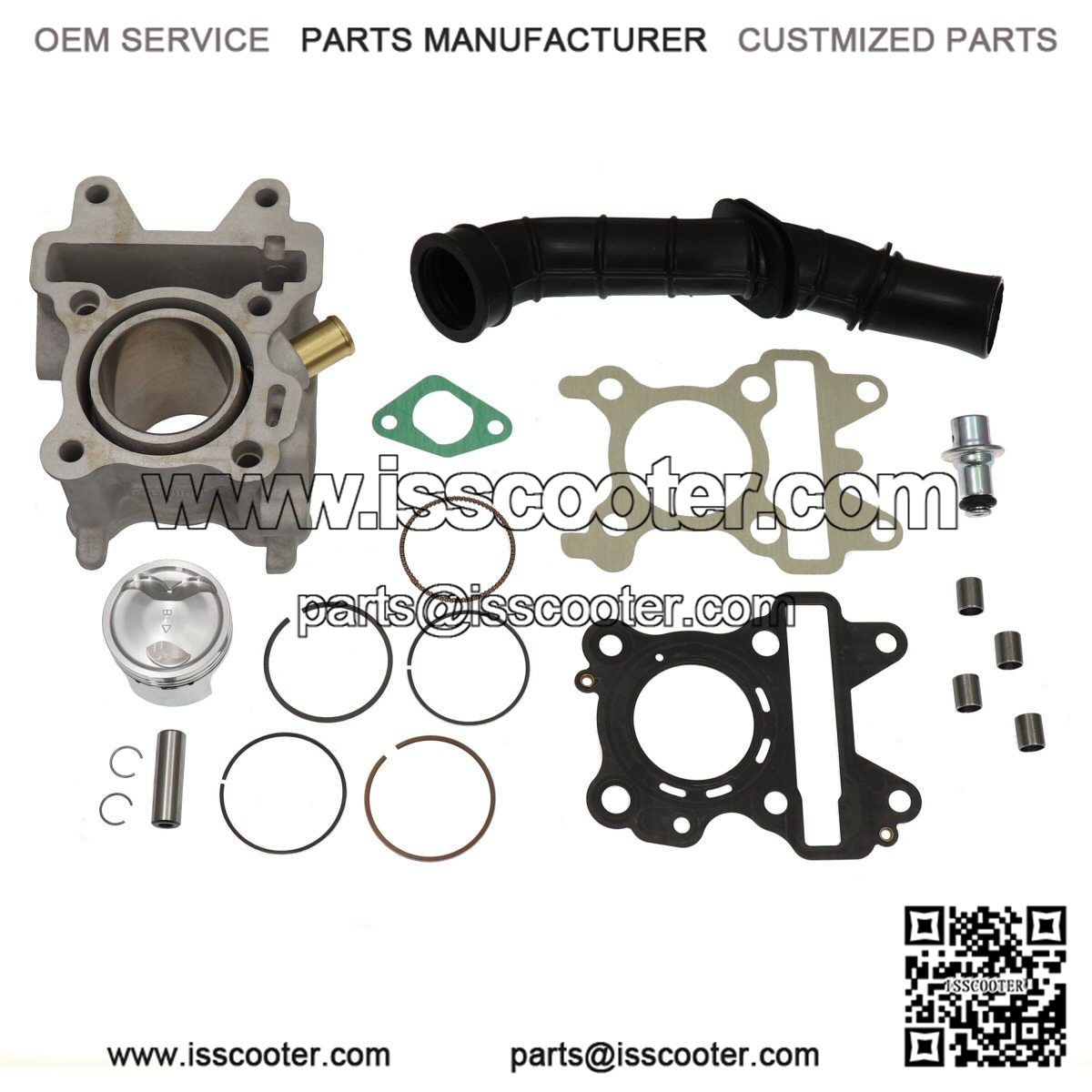 44mm (66.1cc) aluminum sport cylinder kit for 4-stroke Yamaha Zuma, C3, and Genuine Venture 50cc scooters. Kit includes cylinder, piston, rings, piston pin, cir clips, dowel pins, intake tube, fuel pressure regulator, and gaskets.
