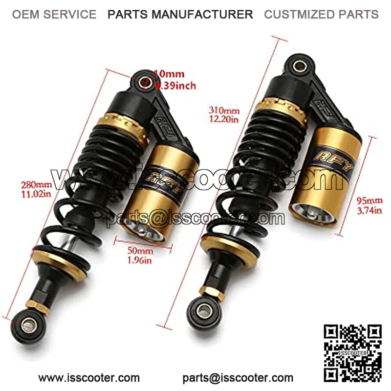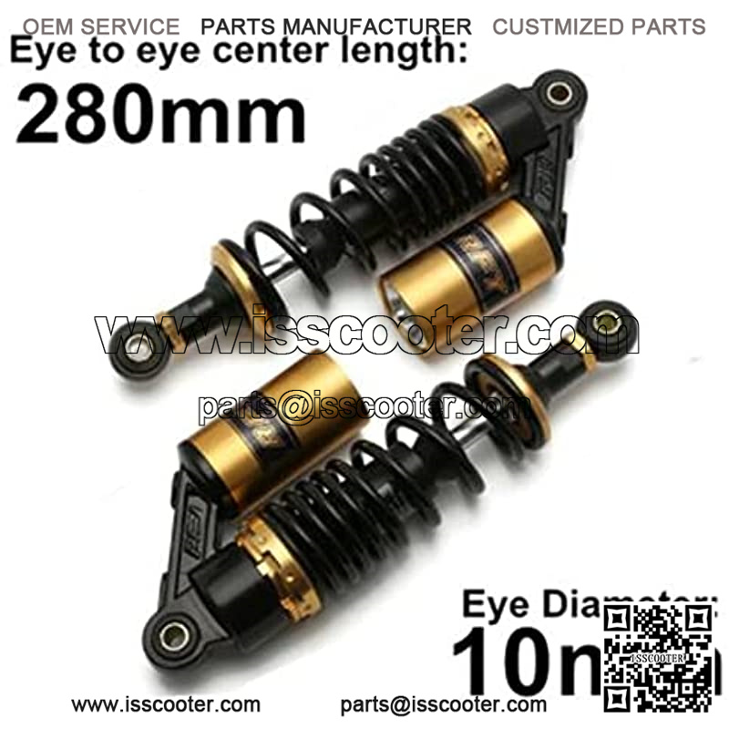 Description??Material: Solid Steel+Aluminium Alloy, Total Length: 310mm (12.2 inch), Eye To Eye Center Length: 280mm (11 inch) . Spring thickness: 6.5 mm(0.26 inch). Max loading:120kg/pair 265lb/pair. The shock absorber is a modified universal type, compatible with most 50cc, 75cc, 90cc, 125cc, 150cc, 250cc, 300cc street cars, off-road vehicles, karts, ATVs, motorcycles and quad bikes.Universal fit for most vehicles, like CBR600RR CBR1000RR CB500 YZF-R1 YZF-R6 YZF-125 XC EXC XCF R800GS R1200GS, etc.