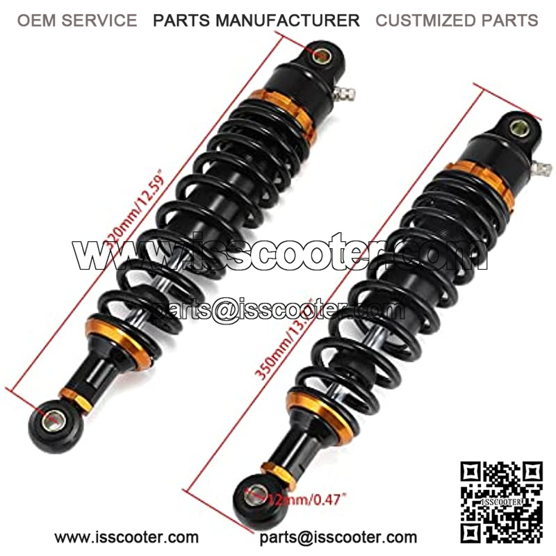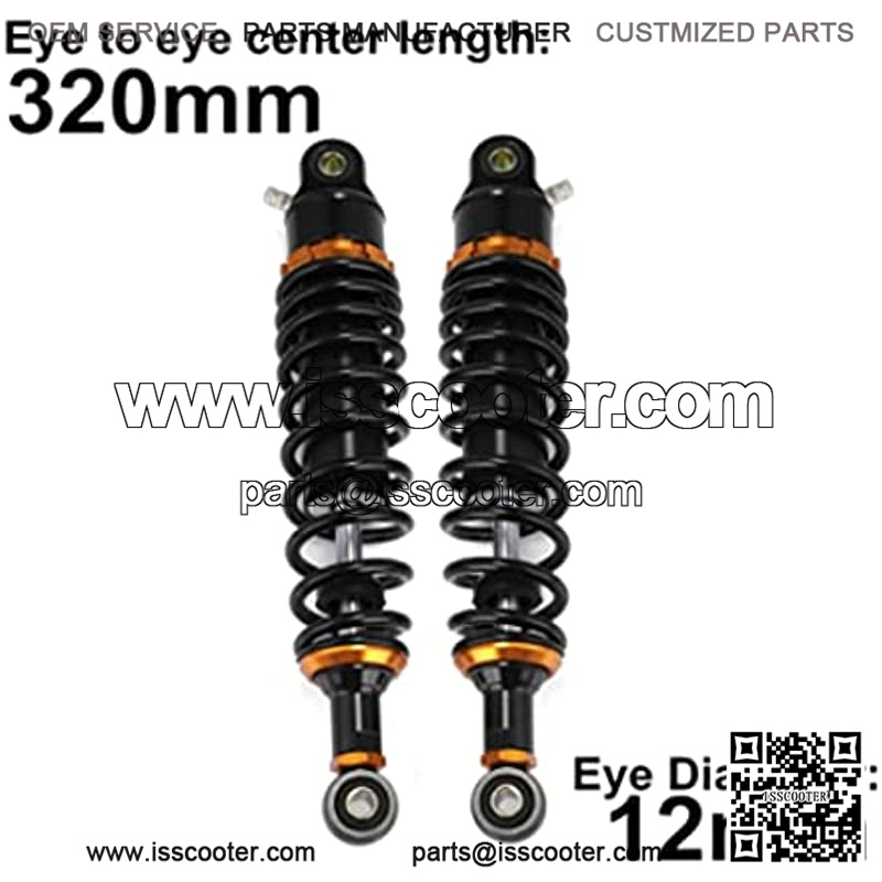 Description??Material: Solid Steel+Aluminium Alloy. Total Length: 350mm (13.8 inch). Eye To Eye Center Length: 320mm (12.6 inch). Spring thickness: 7 mm (0.28 inch) Max loading:200kg/pair 450lb/pair. The shock absorber is a modified universal type, compatible with most 50cc, 75cc, 90cc, 125cc, 150cc, 250cc, 300cc street cars, off-road vehicles, karts, ATVs, motorcycles and quad bikes.Universal fit for most vehicles, like CBR600RR CBR1000RR CB500 YZF-R1 YZF-R6 YZF-125 XC EXC XCF R800GS R1200GS, etc.