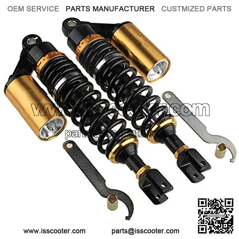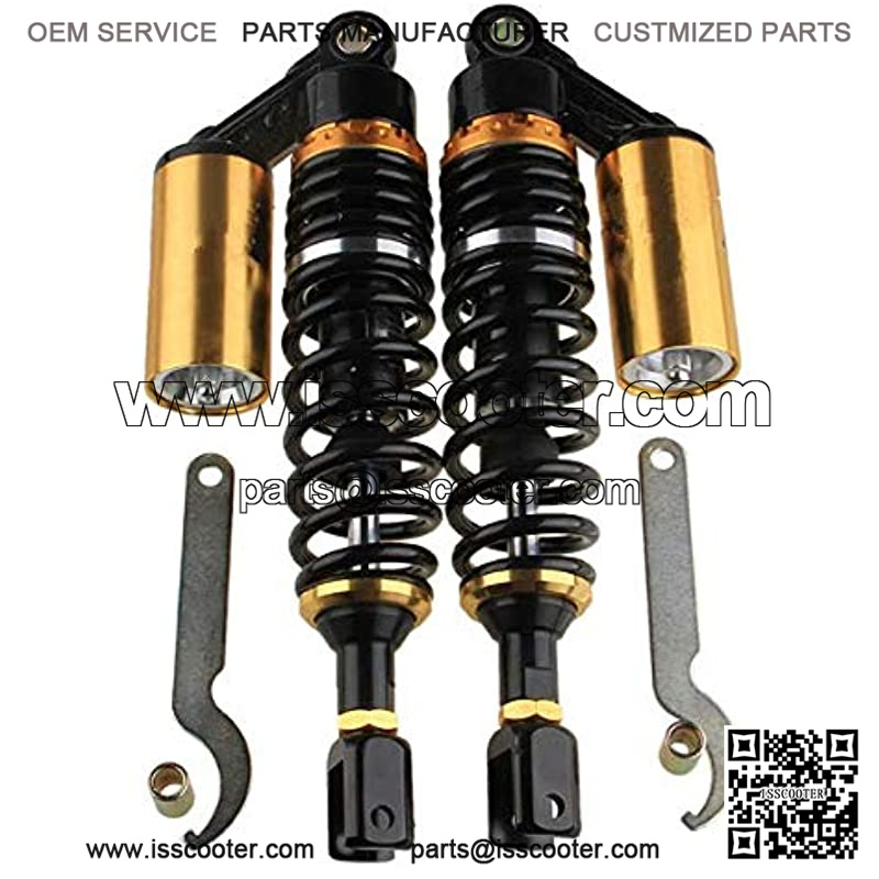Universal for most 150cc~750cc street bikes, Karting(Go kart), Scooters and Moped Quad (ATV) with shocks of 280mm Length of Eye to ClevisBushing hole size: 12mm; Length between holes to clevis: 280mmA pair of rear motorcycle shock absorbers, made of aluminum and stainless steel;Dimension:Total Length:315mm (12 3/8″)Length of Eye to Clevis Eye Core:280mm (11″)Clevis Hole Diameter: 8mmClevis Inner Width: 20mmClevis Maximum Tensile Strength: 2,000 KgfSpring Thickness: 7mmSpring Width: 60mmSpring Stiffness: 110 kgMaximum load: 150kgAir Reservoir: AdjustableFactory Air Pressure: 0.4 MpaMaximum Air Pressure: 0.5 MpaPackage included :One pair shock absorbersNotes:No fitting manual included.Recommend qualified mechanic fits or checks after the fitting of this product.