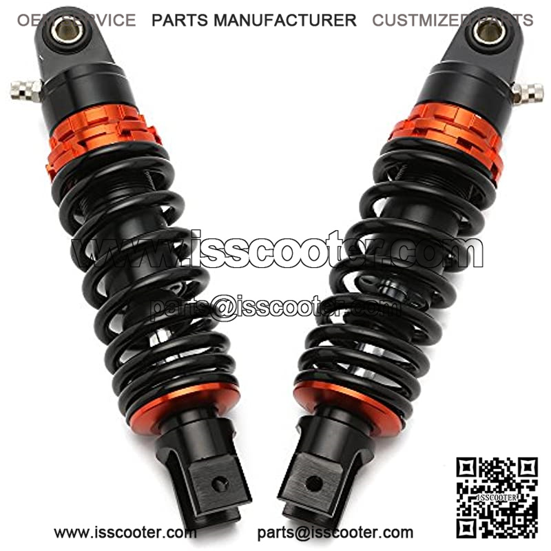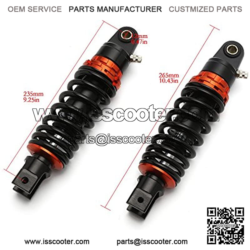 Max loading: <200 kg /440 lbs, The eye of shock has tensile strength more than 2000kgf; The dumper and spring designed for long durability (more than 1 million); Factory Air Pressure: 0.4 Mpa, Maximum Air Pressure: 0.5 Mpa. Our products are made by high-qualified materials with japaneses technology and the advanced computer numerical control processing. the is strictly monitored by ISO9000 standard to make sure the excellent performance and the good condition in the long-term use.It is good and replacement for some Go kart Quad and ATV. Color:Black Our products are made by high-qualified materials with japaneses technology and the advanced computer numerical control processing. the is strictly monitored by ISO9000 standard to make sure the excellent performance and the good condition in the long-term use.It is good and replacement for some Gokart Quad and ATV.Feature:1. Oil seal by N.O.K (japanese high standard)2. The eye of shock has tensile strength more than 2000kgf.3. The dumper and spring designed for long durability(mor than 1 million)4. The point of performance and price comfortable,stable, high quality,high-performance motorcycle partsSpecifications:Color: Black Orange265mm (10.43") total length235mm (9.25") eye to eyeEye Diameter: 12mmEye thickness: 21mmSpring thickness: 7mmSpring Width(approx): 60mm (2.4")Max loading: <=200kgs /440 lbsFactory Air Pressure: 0.4 MpaMaximum Air Pressure: 0.5 MpaPressure can be adjusted by springs and air (nitrogen)Note:- Import duties, taxes and charges are not included in the item price or shipping charges. Customs Clear Charges are not included,You will be responsible for the charges.- Please check with your country??s customs office to determine what these additional costs will be prior to bidding / buying.Package included:2 X Shock Absorbers