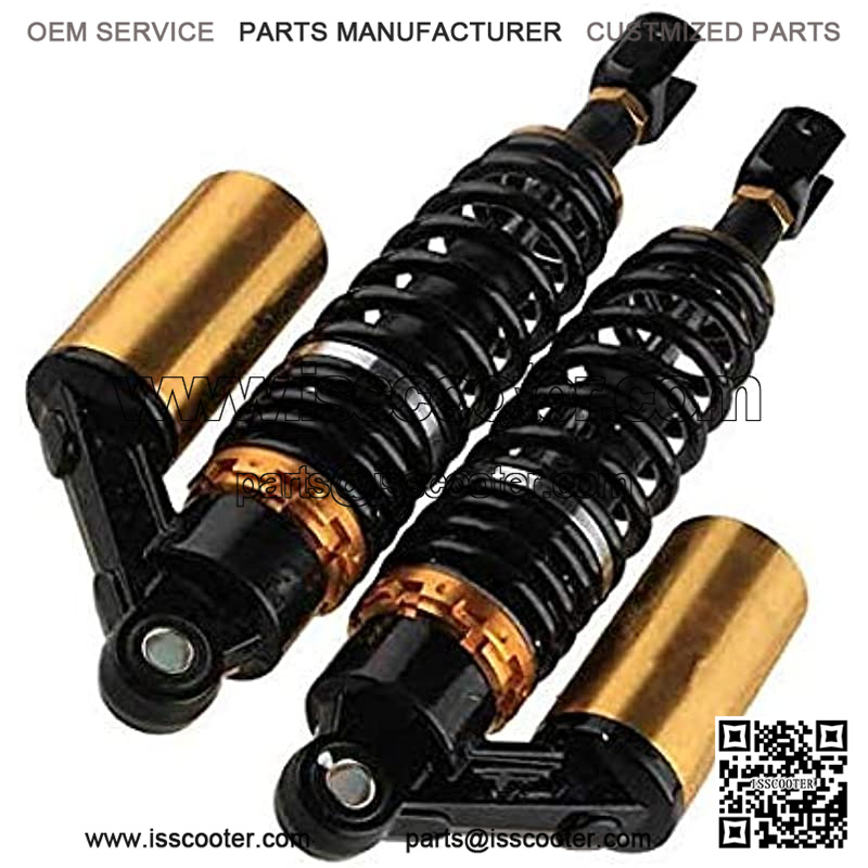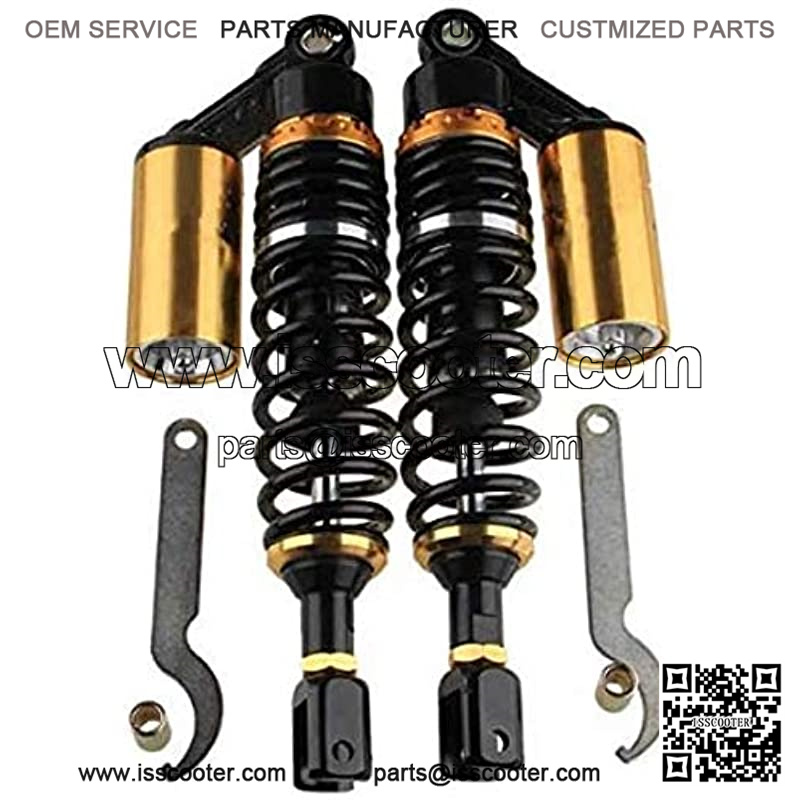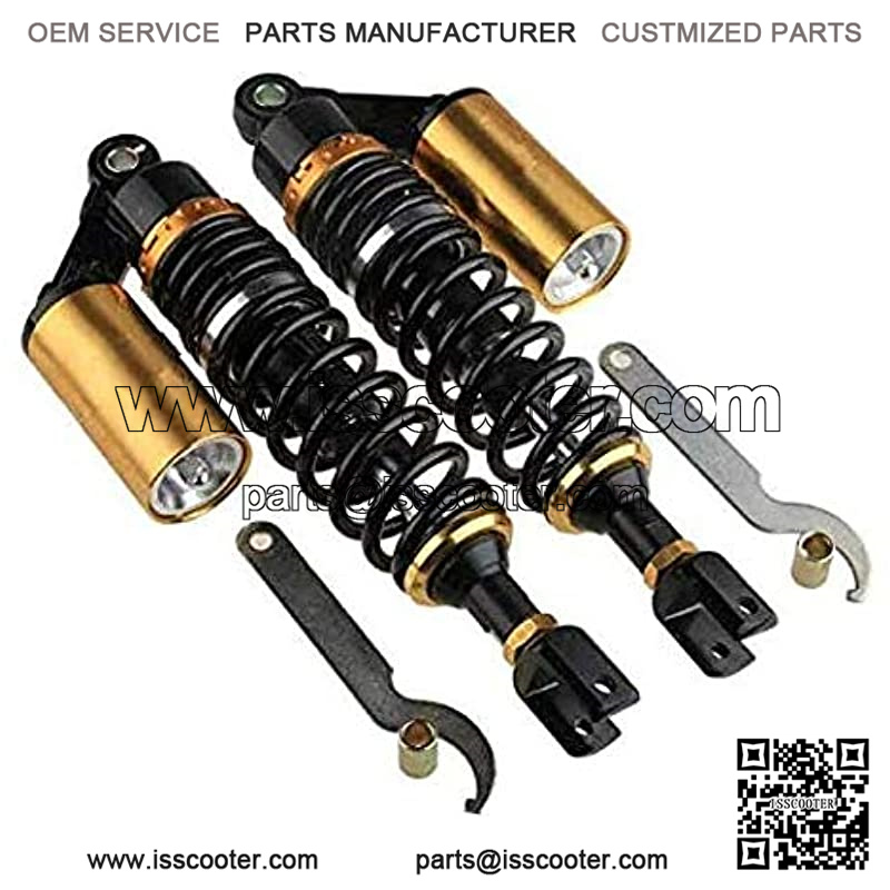 Description:Dimension:Total Length: 315mm (12 3/8″)Length of Eye to Clevis Eye Core: 280mm (11″)Clevis Hole Diameter: 8mmClevis Inner Width: 20mmClevis Maximum Tensile Strength: 2,000 KgfSpring Thickness: 7mmSpring Width: 60mmSpring Stiffness: 110 kg Maximum load: 150kg (330 lbs)Air Reservoir: AdjustableFactory Air Pressure: 0.4 MpaMaximum Air Pressure: 0.5 MpaUniversal fit for most 280mm Motorcycle Shock Absorber For Honda/Yamaha/Suzuki/Kawasaki;Dirt bikes, Gokart, ATV, Motorcycles and Quad.Pressure can be adjusted by springs or air (nitrogen); Operation of the coil-over springs and air cylinder is helpful to reduce the shock.Shock Absorber bottom/ends type: U-Type( Clevis End )No instruction included, professional installation recommended.Packaged Included: 1 Pair Shock Absorbers,Please check the size details and make sure it will fit your bike before purchase