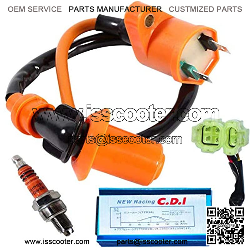 High Performance Racing Ignition Coil for GY6 50cc 150cc 125cc 4-stroke Engines Scooters, ATVs, Mopeds, Quad, Pit Bikes, Dirt Bikes.Fit Honda TRX200 TRX200D TRX200SX TRX250 ATV. High Performance Racing Ignition Coil Compatible with these scooters:TaoTao, Buyang, Roketa, Coolsport, NST, BMX,Sunl, AIM-EX, Baja,Kazuma,Panterra, Kymco, Carroll Stream Eagle etc. GY6 Ignition Coil AKA 50CC Ignition Coil,Moped 50CC Ignition Coil,50CC Scooter Ignition Coil,Ignition Coil 50CC,Taotao 50CC Ignition Coil,50CC GY6 Ignition Coil,Kazuma 50CC Ignition Coil,150CC Ignition Coil,GY6 150CC Ignition Coil,Ignition Coil 150CC,150CC Scooter Ignition Coil,Taotao 150CC Ignition Coil,GY6 High Performance Ignition Coil,Gy6 150CC Ignition Coil,Ignition Coil Gy6,50CC GY6 Ignition Coil,Racing Ignition Coil GY6. This CDI is 6pins,it works with the GY6 type plug on it,with an AC ignition system.Plug and Play installation makes installation a breeze! If your CDI has the same plug,this will work for you!GY6 CDI Box AKA GY6 performance CDI,GY6 Racing CDI,50CC CDI,CDI 50CC,50CC CDI Box,CDI 50CC scooter,CDI Box for 50CC scooter,CDI 150CC,CDI 150CC scooter,CDI Box 150CC,CDI Racing 150CC. This spark plug is a high peformance racing 3 electrode spark plug.Gy6 150CC Spark Plug AKA 139QMB Spark Plug,50CC Gy6 Spark Plug,Kazuma 50CC Spark Plug.