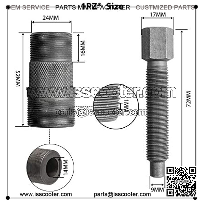 24mm right hand thread use for—most GY6 50 4 Stroke Scooter Moped ATV; 27mm left hand thread use for—most GY6 125 150cc Scooter and other 125cc Motorcycles