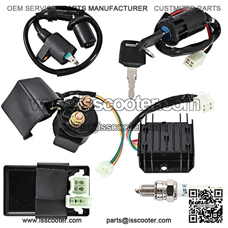 Package Including: Wiring harness, CDI, spark plug, ignition coil, solenoid relay, rectifier, ignition switch, ATV switch and magneto stator.