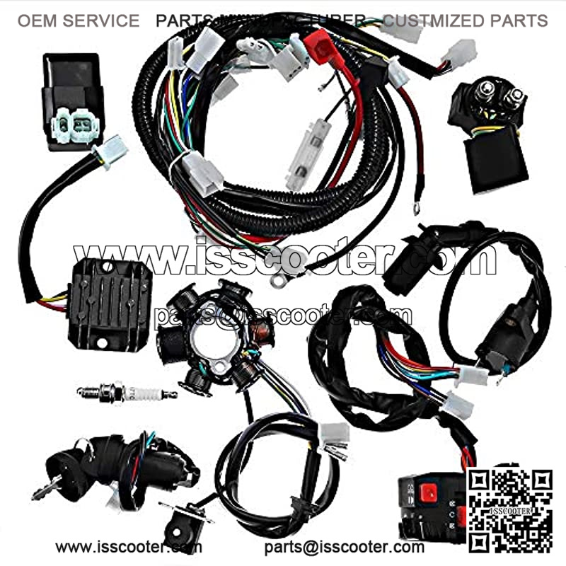 Package Included: 1 x GY6 125cc 150cc Wiring harness, 1 x CDI, 1 x Spark Plug, 1 x Ignition Coil With Lead, 1 x Solenoid Relay, 1 x Rectifier ( Voltage Regulator ), 1 x Ignition Switch ( 2 keys, waterproof ), 1 x Upgraded Multi-functional ATV Switch, 1 x MAGNETO Stator ( 6 Pole 5 Wire, 2 fixing holes )