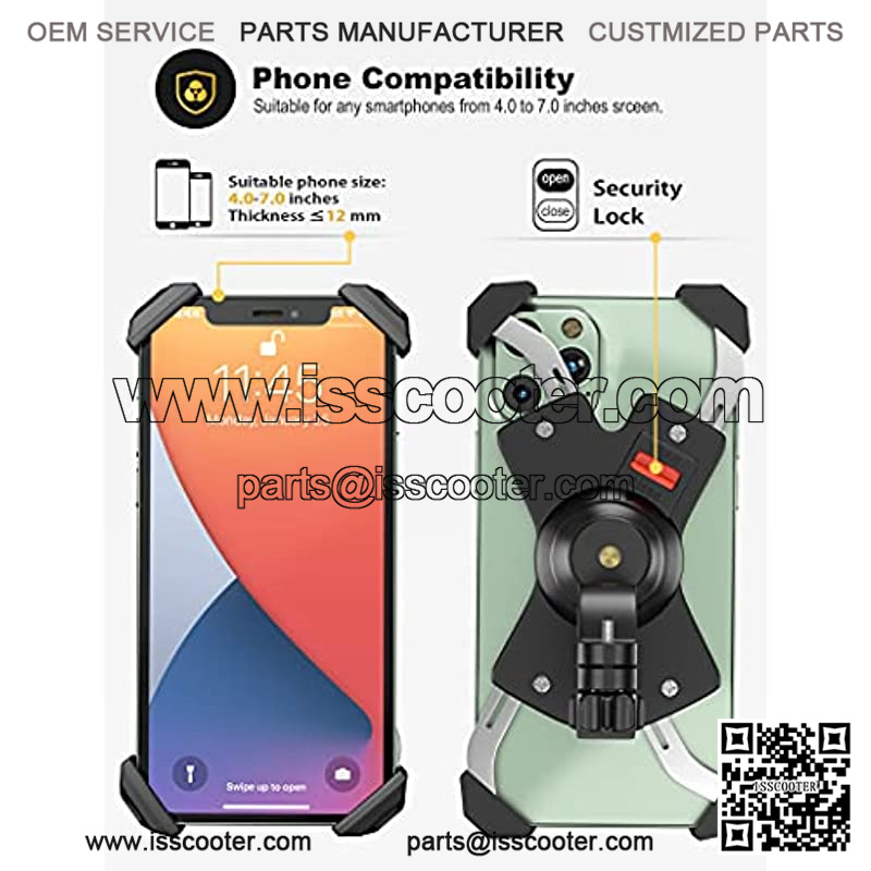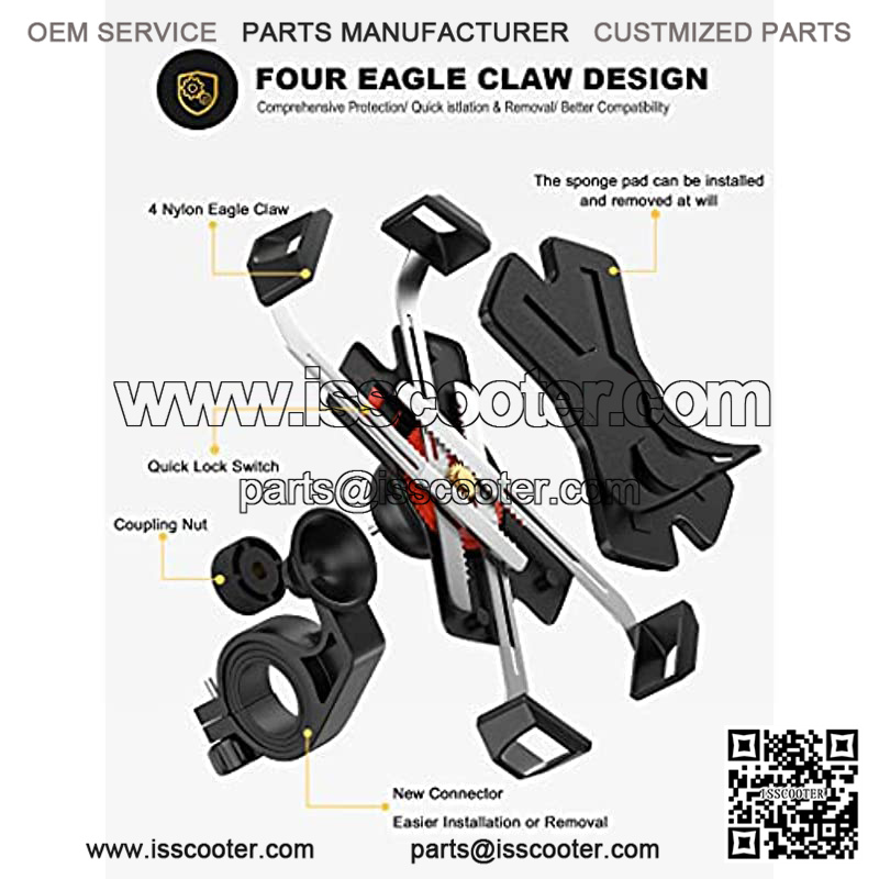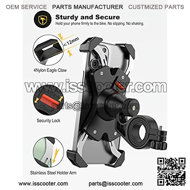 ??Sturdy??Secure??The motorcycle phone mount has 4 stainless steel clamp arms, which can tightly fix each corner of the mobile phone on the bicycle holder. It is safe and steady for your cell phone even on rough road..