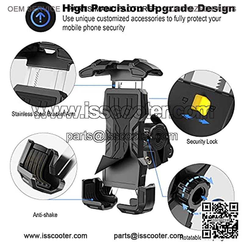 ??Safe and firm?? bicycle mobile phone holder is composed of a stainless steel clamp arm, a non-slip rubber pad and a stable support frame.sturdy and shockproof. Keeps stable no matter on the highway or bumpy mountain road.