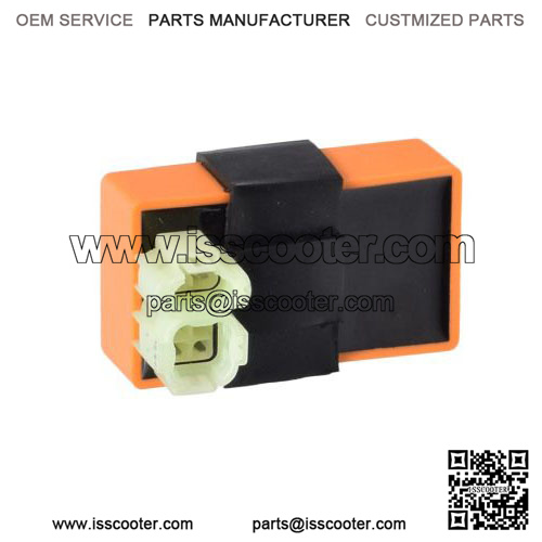 Our orange-colored AC High Performance CDI Module (Ignitor) for 50cc, 90cc, 110cc, 125cc, 150cc gas scooters and ATVs sports a 6-pin (4+2) rounded connector and is one of the most common ignitors found on today’s popular powersports models. This is a “no-rev limit” module that offers a 5 to10% acceleration increase and better top speed.
