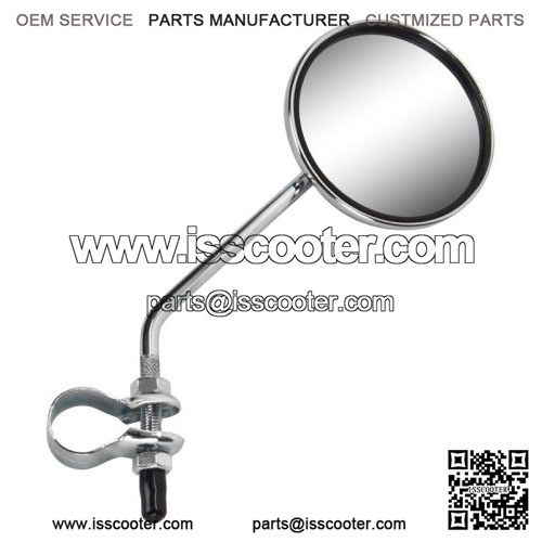 Clamp on rear-view mirror with built in reflector on the backside for extra viability. Works great on anything with a handlebar; mobility scooters, recreational scooters, mini bikes, etc. A great aftermarket part at a low price.