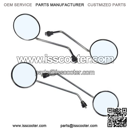 An excellent scooter accessory! Here is our Round Mirror Set for scooters. This is a set of two 4″ mirror discs mounted atop your choice of handy 8″ rods, or longer 9-3/4″ rods. The 8″ chrome rod supports a black backed mirror while the longer 9-3/4″ chrome rod has a chrome backed mirror.